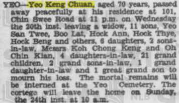 The marriage will take place tomorrow at 743 Paya Lebar Road, between Yeo Hock Gum 6th son of Mrs Yeo Keng Chuan, and the late Mr Yeo Keng Chuan and Miss Tok Kim Eng, 3rd daughter of Mrs Tok Cheng Tuan and the late Mr Tok Cheng Tuan